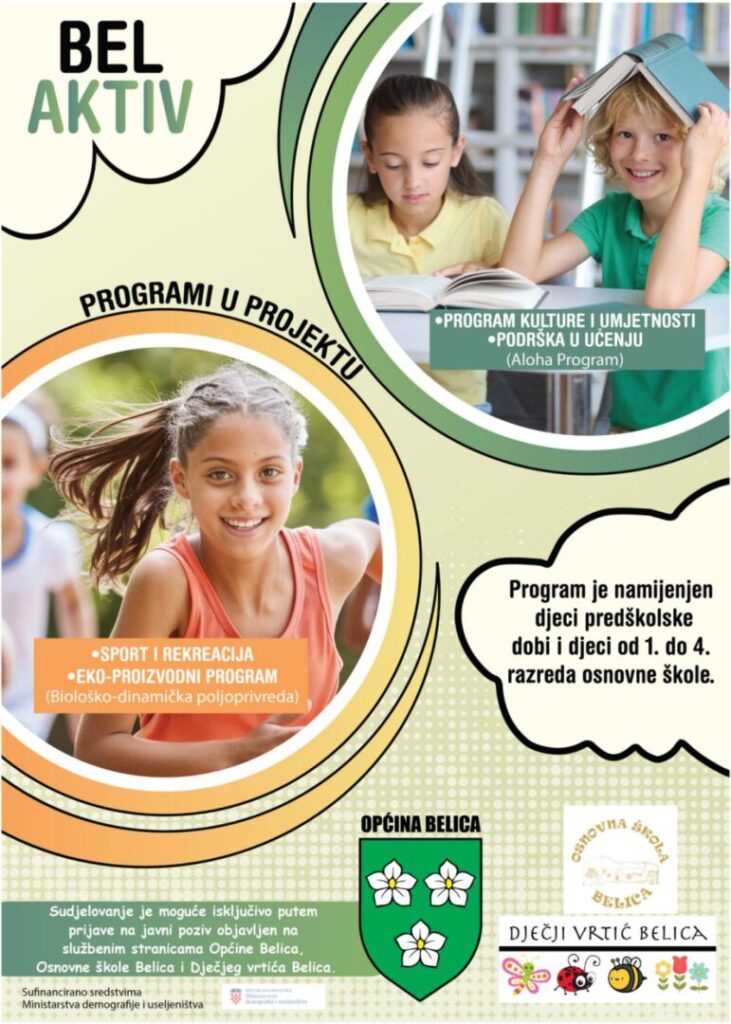 Općina Belica, Dječji vrtić Belica i Osnovna škola Belica s veseljem pozivaju djecu predškolske dobi te djecu od 1. do 4. razreda osnovne škole da se uključe u jedan od pet raznovrsnih i besplatnih programa koji se provode u okviru projekta “BEL-AKTIV”. Više o projektu na poveznici.